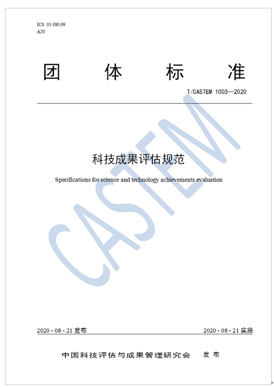 2020年8月21日,中國(guó)科技評(píng)估與成果管理研究會(huì)發(fā)布實(shí)施了T/CASTEM 1003—2020《科技成果評(píng)估規(guī)范》團(tuán)體標(biāo)準(zhǔn),鼓勵(lì)研究會(huì)全體會(huì)員單位及其他有關(guān)單位積極采用。該標(biāo)準(zhǔn)由科技部科技評(píng)估中心牽頭起草,是研究會(huì)在科技成果評(píng)估領(lǐng)域發(fā)布的首個(gè)指導(dǎo)性標(biāo)準(zhǔn)。